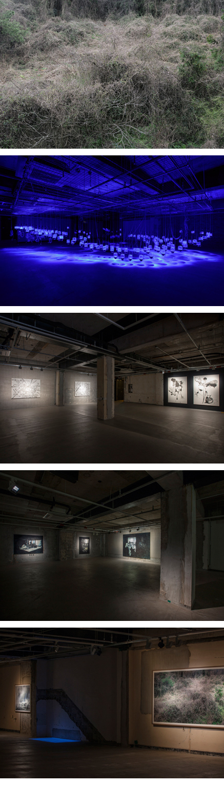 아라리오뮤지엄 탑동바이크샵은 제주도 출신의 젊은 작가 부지현, 이다슬, 이소정, 좌혜선이 참여하는 <제주 정글>전을 개최합니다. ‘정글’은 밀림과 같은 자연 환경뿐만 아니라 동시에 끝없는 경쟁, 이익 추구 등으로 대변되는 인간 사회를 묘사할 때 사용됩니다. 참여 작가들은 ‘정글’이 갖고 있는 이러한 이중적인 의미에 집중합니다. 수많은 구조물들이 미로를 형성하여 푸른 바다와 파도를 연상시키는 부지현의 설치작업, 사람으로 인해 인공적으로 변모한 제주의 자연을 포착한 이다슬의 사진들, 동양화의 필선과 발묵을 이용해 유기적인 추상 이미지를 자동발생적으로 그려내는 이소정의 작품들, 그리고 부엌, 거실 등 가정집의 실내를 배경으로 어둠과 빛이 공존하고 있는 좌혜선의 동양화 기법의 작품들까지 다채로운 작업들을 만나볼 수 있습니다. 제주도 출신이라는 정체성을 가진 작가들의 작업은 우리가 알고 있는 전형적인 제주의 모습이 아닌, 사회 내면에 존재하고 있는 제주의 문제와 동시대의 모습을 젊은 시각으로 보여줄 것입니다.